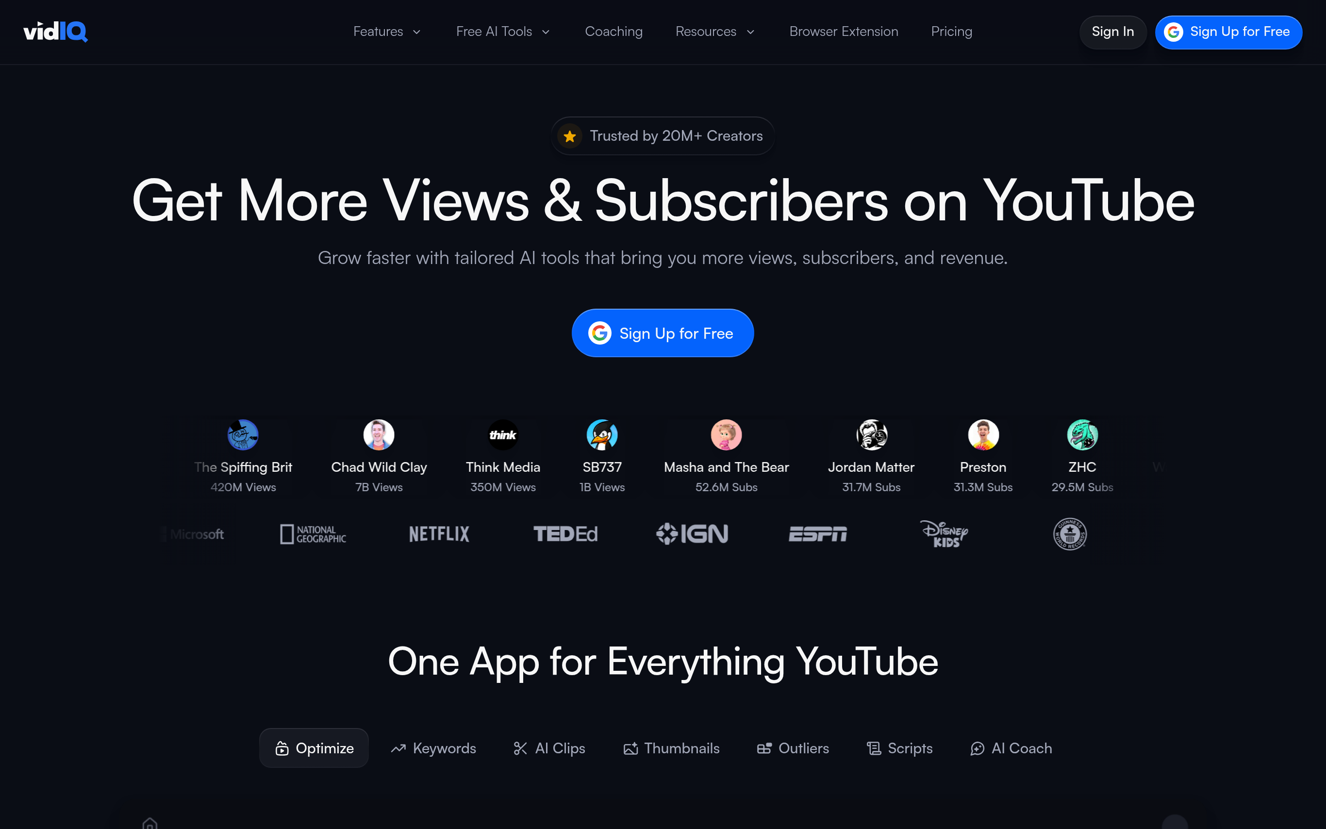 vidIQ is a powerful YouTube optimization tool designed to help creators increase their views, subscribers, and overall channel performance. With tailored AI-powered insights, it enhances creators' visibility and engagement, empowering them to grow their audience and revenue. The platform stands out with features such as keyword scoring, competition analysis, and video performance tracking that allow creators to refine their content strategies effectively. Trusted by over 20 million creators, vidIQ delivers real results by transforming data into actionable insights that foster growth and monetization on YouTube.